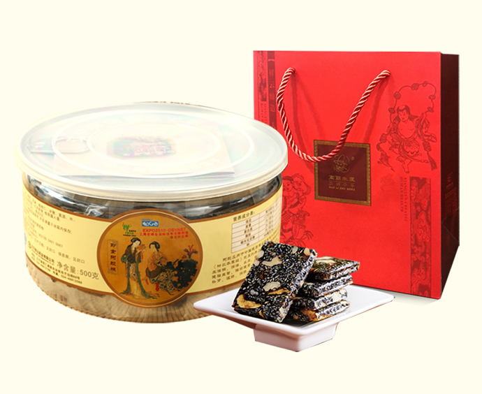 即食阿膠是根據(jù)唐代宮廷秘方“貴妃美容膏”組方所得,1920 年由東阿潤(rùn)惠堂第六代掌柜任國(guó)興研制發(fā)明,形成現(xiàn)代固體形態(tài)、 方便攜帶和食用的“即食阿膠”(阿膠糕)。任國(guó)興隨之首創(chuàng)凝膠 成糕法,將黑芝麻、核桃仁、桂圓肉、紹酒、冰糖等… …